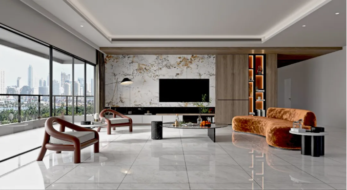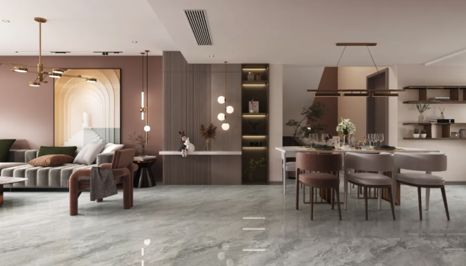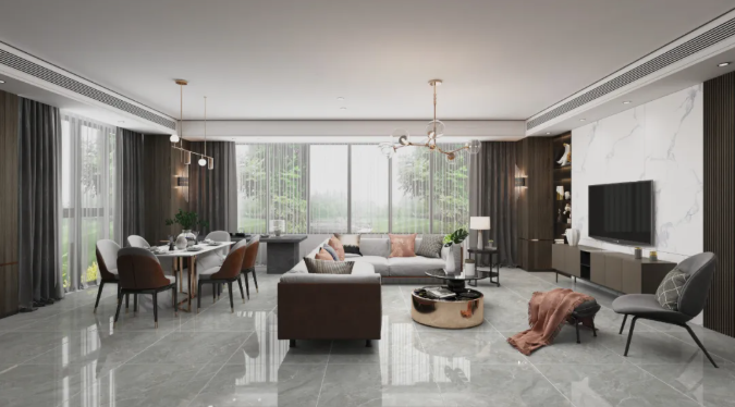 與其他顏色相比,窗前莫蘭迪色係椅子可以說是點睛之筆,配上800x800mm科隆奧尼灰,無論是公共空間、還是客廳、餐廳、廚房都能應付自如,灰調色澤凸顯細膩質感,給人一種直抵人心的靜謐和優雅。